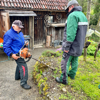 Ganz enorm wichtig ist heute unser „Maschinendoktor“ Paul. „Der Fadenmäher hat keinen Faden mehr.“ „Kannst du mir die Maschine mal starten, ich kriege sie nicht an.“ „Paul, warum läuft das Ding nicht richtig?“ Mit Routine und in aller Ruhe löst Paul die einzelnen Probleme und es gibt keine Stellschraube, die er nicht kennt. Einfach toll.